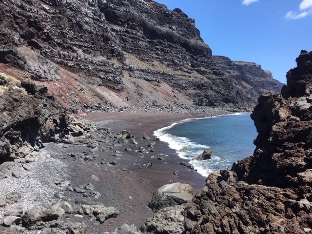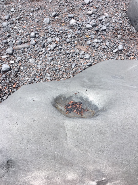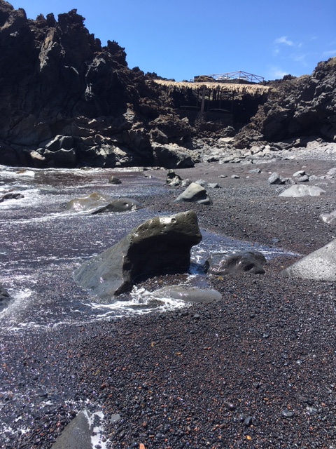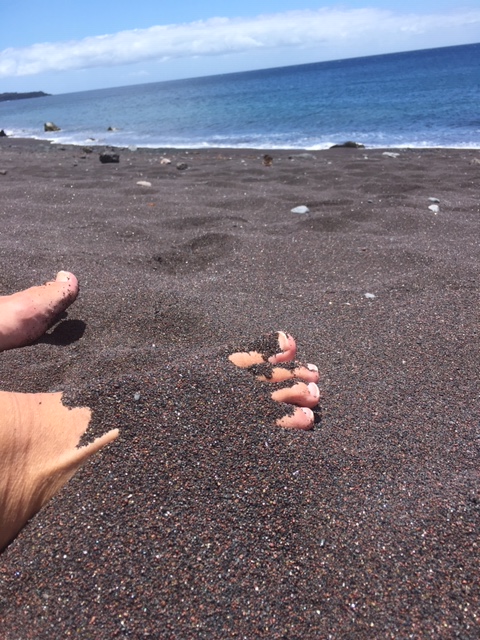 Och sanden. Det finns sandkorn som är svarta, guldfärgade och gråa. Allt är av havet så slipat och lent att du kan borra ner dina fötter var som helst, gå barfota utmed hela stranden (den är inte lång…) utan att det blir vasst en endaste gång. Från havet har det spolats upp någon slags rosafärgad växt från något rev.