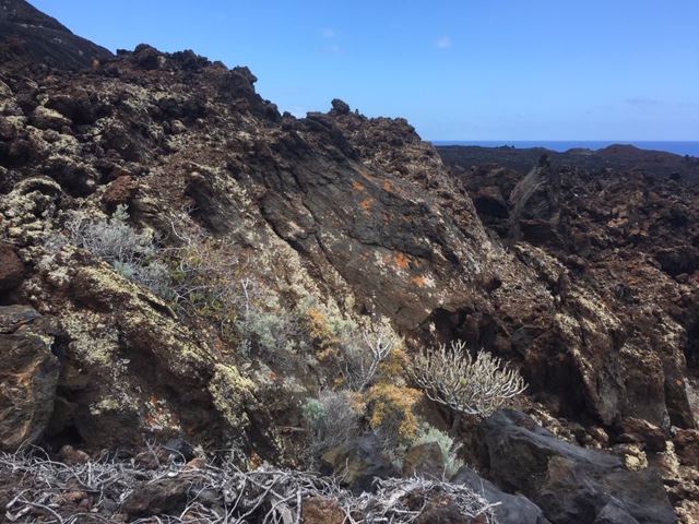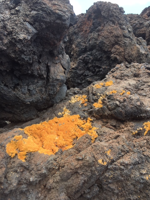 Att ta sig dit var allt ifrån lätt. Tror vägen ibland kan vara avstängd för risk för nedfallande stenblock. Men nu var bommen öppen. Det är slingrande sandvägar med vassa stenar som bilen måste klara av skumpa fram på. Det är liksom oorganiserat. Och samtidigt så oerhört vackert. Den här delen av ön består av klumpar från lavasten, knallorange lav och gråa buskar. Det doftar varmt, salt och kargt. Stenarna som är själva fundamentet i den här miljön är viktlösa. Det känns som kolbitar när man lyfter upp dom. Man förstår att det är just bränd sten; lavasten.