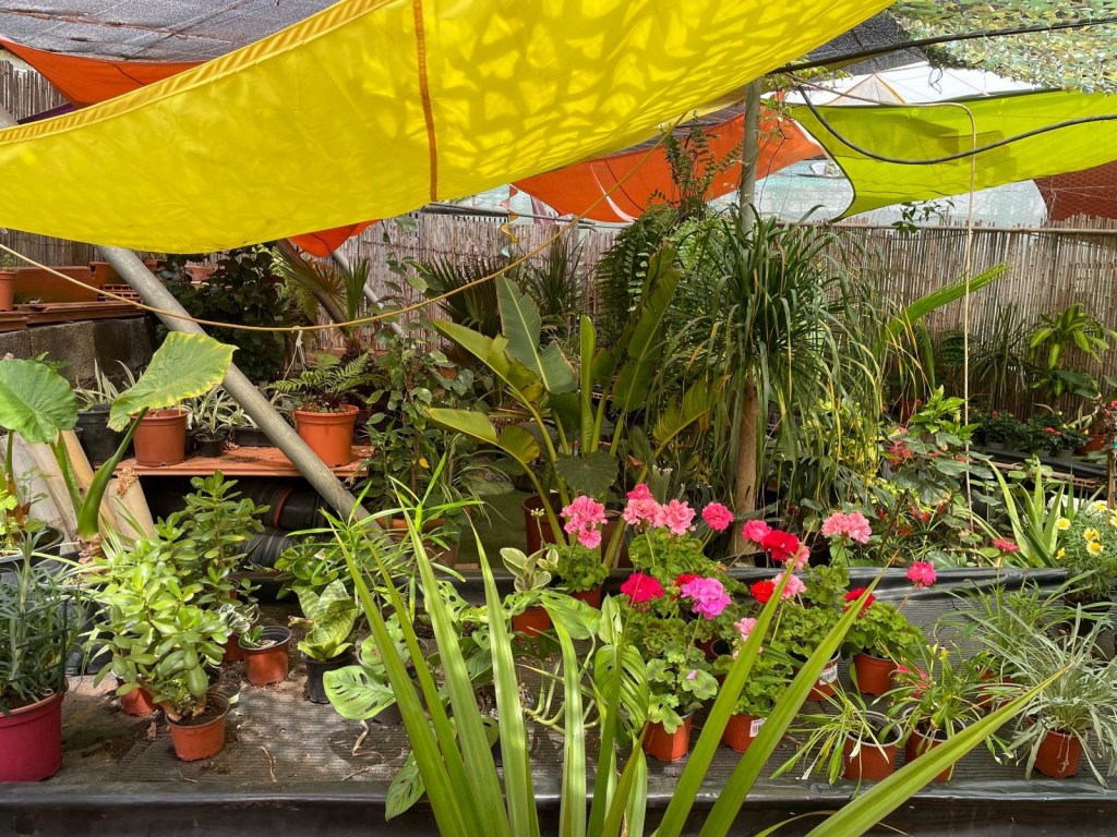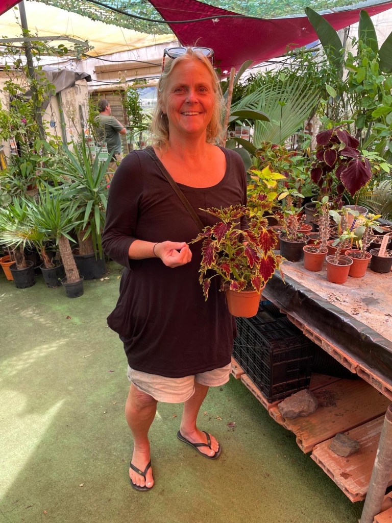 Det var en plantshop. Och inte vilken som helst; här fanns olika slags träd (som vi har letat), palmer (det ska vi inte ha någon mer), blommor, suckulenter och kryddor. Det var varmt ångigt och dom färgglada segeldukarna bildade ett varmt ljus som både vi och växterna trivdes i. Mannen som hade stället var generös och trevlig, han använde telefonens översättare för att förklara skötselråd för oss (det var mycket nytt för vår stappliga spanska att förstå). Vi frågade om vilka träd som kunde passa uppe hos oss i El Pinar och han räknade upp en massa. Alla citrusträd, persikor, paraguayos, granatäpplen, valnötter, plommon, kiwi , fikon … vi kunde inte köpa något just nu, vi åker ju hem om ett par veckor men frågade hur det var i slutet av september när vi kommer hit igen?